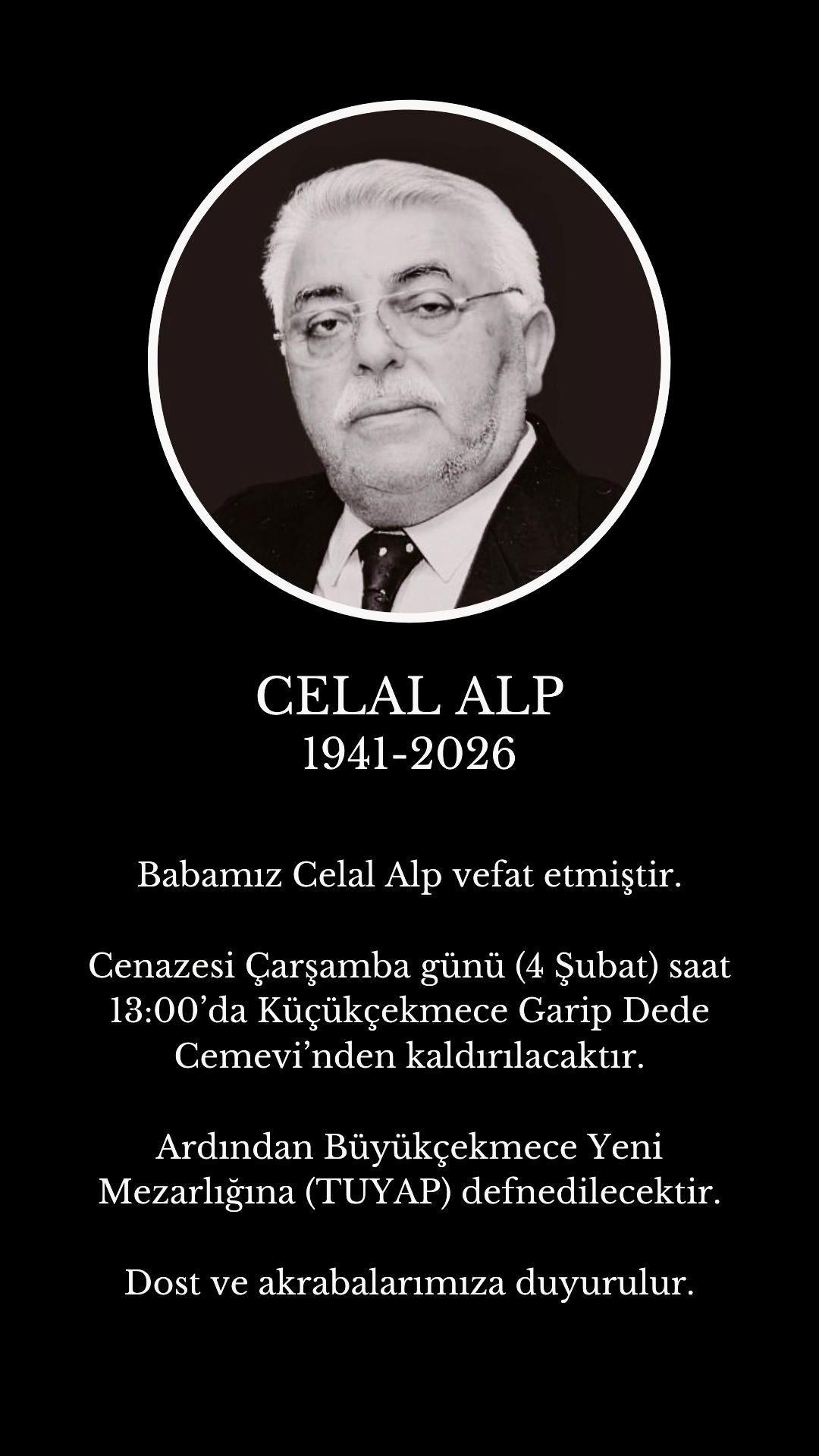 Celal Alp için 4 Şubat Çarşamba günü saat 13.00’te Küçükçekmece Garip Dede Cemevi’nde cenaze töreni düzenlenecek. Törenin ardından merhumun naaşı, Büyükçekmece Yeni Mezarlığı’na (TÜYAP) defnedilecek